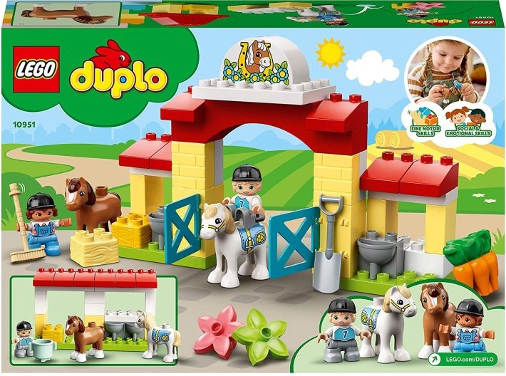LEGO® DUPLO® Town Zirgu stallis un ponija aprūpe (10951) iedvesmo bezgalīgi jautru un rotaļīgu mācīšanos ar 2 mīļiem ponijiem un visu, kas viņu aprūpē vajadzīgs mazajiem dzīvnieku mīļotājiem. Ar zēnu un meiteņu figūriņām, 2 mīlīgiem ponijiem, klasiskā dizaina staļļiem ar šūpoles vārtiem, ūdens podu, burkāniem un siena ķīpu ar īstu faktūru. Spēlējot un kopjot ponijus, barojot, ķemmējot un sagatavojot miegam, bērni uzlabo savas smalkās motorikas un sociālās prasmes un iepazīstas ar emocijām. Lieliska dāvana krāsainai spēlei Ziemassvētkos, svētkos, dzimšanas dienā vai citos gadījumos bērniem no 2 gadu vecuma. Galvenā ēka ir 19 cm augsta, 15 cm plata un 9 cm dziļa. Spēļu komplektu var būvēt dažādos veidos, un tas ir viegli savietojams ar citām LEGO® DUPLO® lauku sētu rotaļlietām. Visi LEGO® DUPLO® rotaļlietu komplekti ir prasmīgi izstrādāti ar atjautīgām īpašībām, kas veicina neierobežotu spēli, kurā vecāki var dalīties ar saviem mazajiem. LEGO® DUPLO® spēļu komplekti atbilst stingriem nozares kvalitātes standartiem, padarot tos viegli paņemamus, savienojamus un atdalāmus ar maziem pirkstiņiem - kā tas ir bijis kopš 1969. gada! LEGO® DUPLO® klucīši un to daļas tika mesti, karsēti, smalcināti, savīti un analizēti, lai nodrošinātu, ka tie atbilst visaugstākajiem bērnu drošības standartiem.