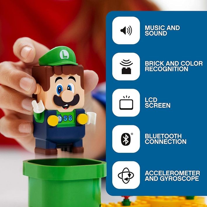 LEGO® Luigi™ figūrai ir krāsu sensors, LCD ekrāns, lai attēlotu dažādas tūlītējas reakcijas uz kustībām, kā arī skaļrunis, kas atskaņo leģendārās skaņas un mūziku no videospēles.
