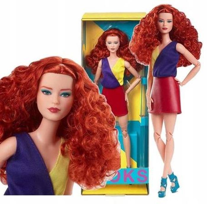 Lellei Barbie® ir krāšņi sarkani mati ar apjomīgām cirtām, kas krīt uz pleciem. Viņai ir zilas acu ēnas un granāta lūpas.