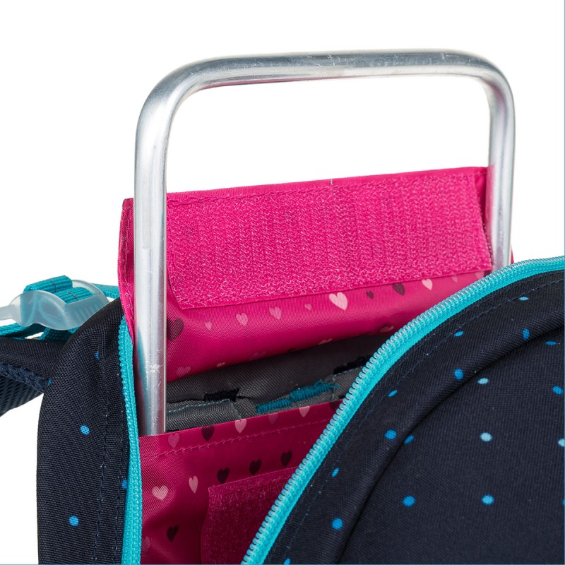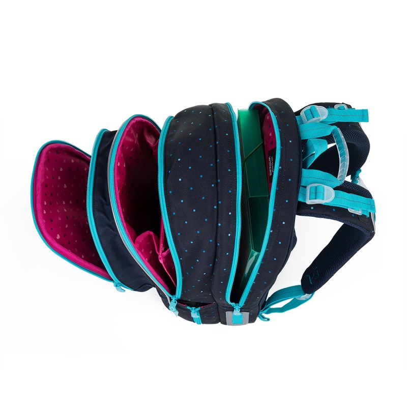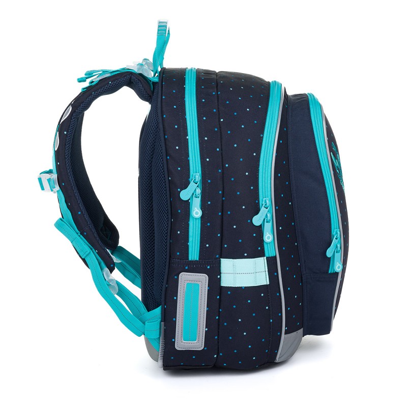 Topgal MIRA 24009 ir viegla un ietilpīga mugursoma, kas ideāli piemērota meitenēm ar augumu no 125 cm. Tās tumši zilā krāsa ar tirkīza akcentiem un kolibri izšuvumu piešķir tai modernu un pievilcīgu izskatu.