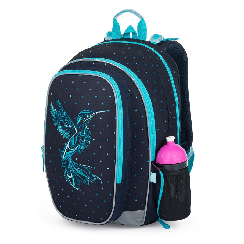 Topgal MIRA 24009 — stilīga ortopēdiska mugursoma ar kolibri izšuvumu 2.–5. klases skolniecēm