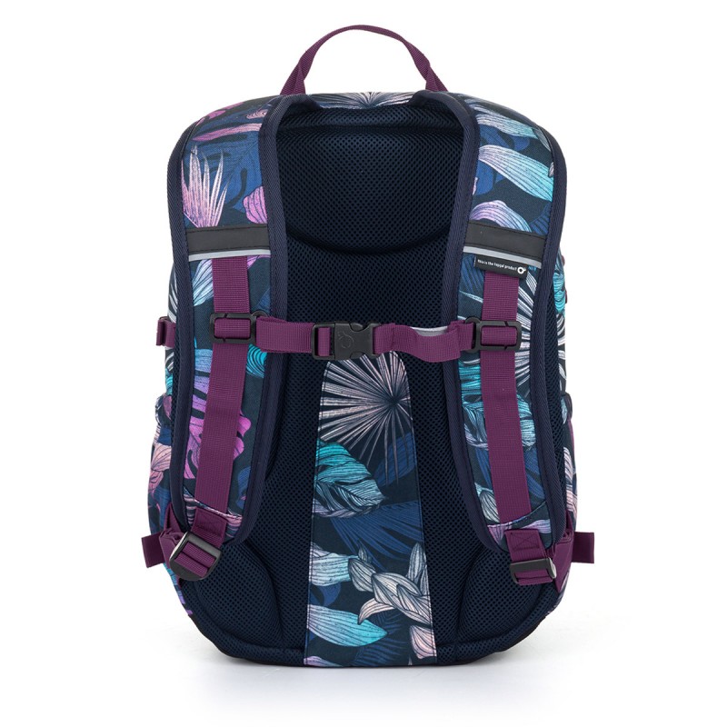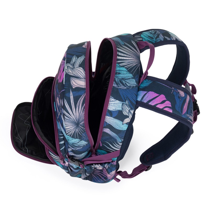 Mugursoma ar monstera lapu dizainu un violetiem akcentiem ir piemērota skolēniem un studentiem ar augumu no 145 cm. Tā apvieno stilīgu izskatu, funkcionalitāti un muguras atbalstu ikdienā.