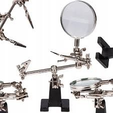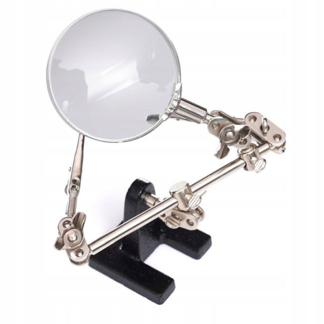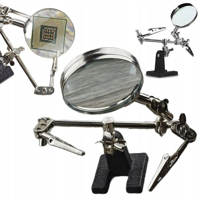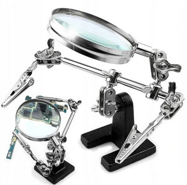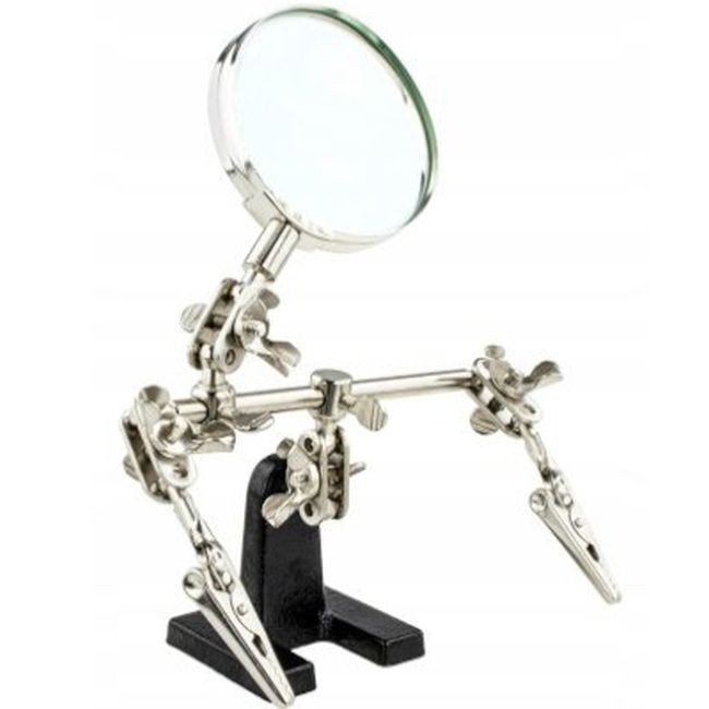 Ierīces roku galos ir uzstādīti aligatora klipši, kas ļauj regulēt leņķi. Palielināmais stikls ar 6 cm diametru un 2,5 dioptriju palielinājumu.