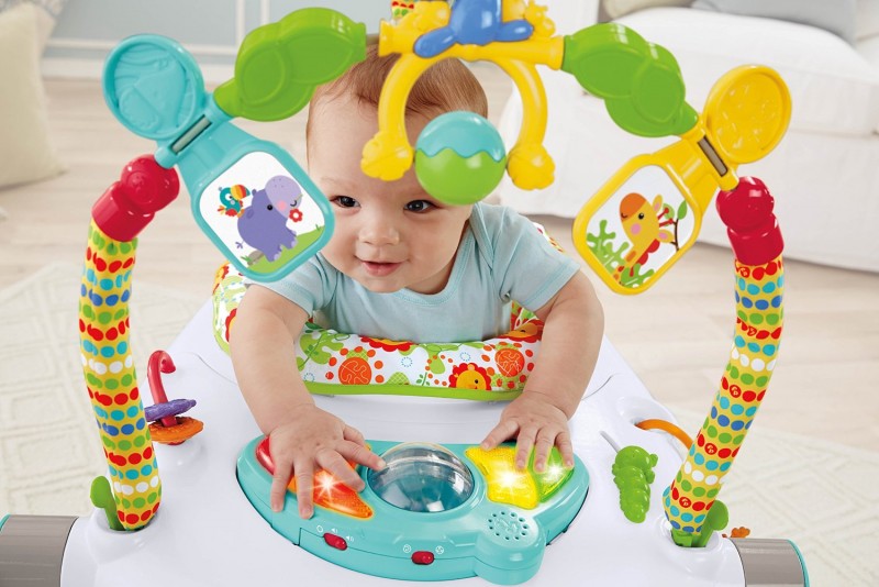 Можно весело играть и прыгать (прыжки активируют огни и звуки тропического леса) со всеми игрушками вокруг – и над головой – при этом сиденье вращается, что позволяет малышу исследовать все игрушки. Прочная, свободностоящая конструкция позволяет малышу прыгать свободно и безопасно. Интерактивная игрушка награждает прыжки малыша огнями, звуками и музыкой. Малыш раскручивает барабан, чтобы активировать огни и музыку (мама может активировать их на 5 минут непрерывной игры). Малыш может хлопать по висящей тропической лягушке и тукану. Маленький забавный тигренок играет с малышом в прятки! Малыш раскручивает ящерицу, и она издает звук трещетки; ударяет по обезьяне, чтобы раскрутить ее. Перекладина с бусинами помогает развлекать малыша. Мягкое покрытие пружин оберегает его пальчики. 3 варианта высоты помогают подобрать подходящую. Малыш раскручивает солнце в веселой игре! Плюшевую подушку сидения можно стирать в машине и сушить в сушилке. Дополнительная опора внутри основания пружин обеспечивает дополнительную безопасность.