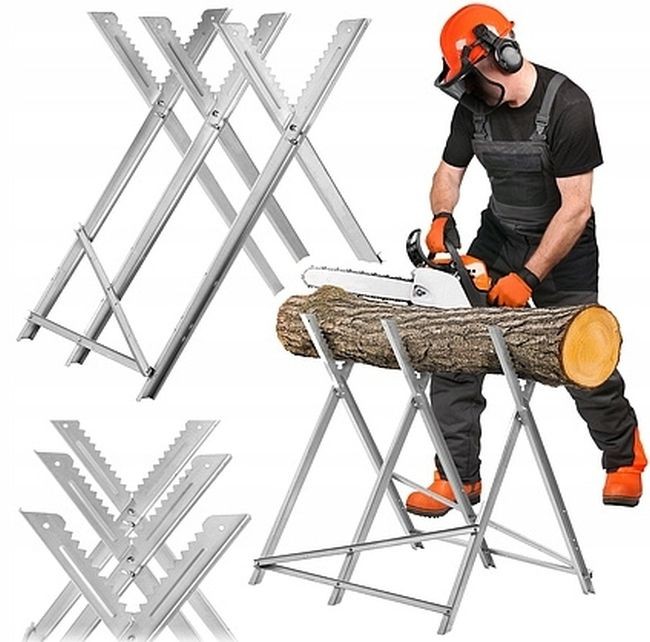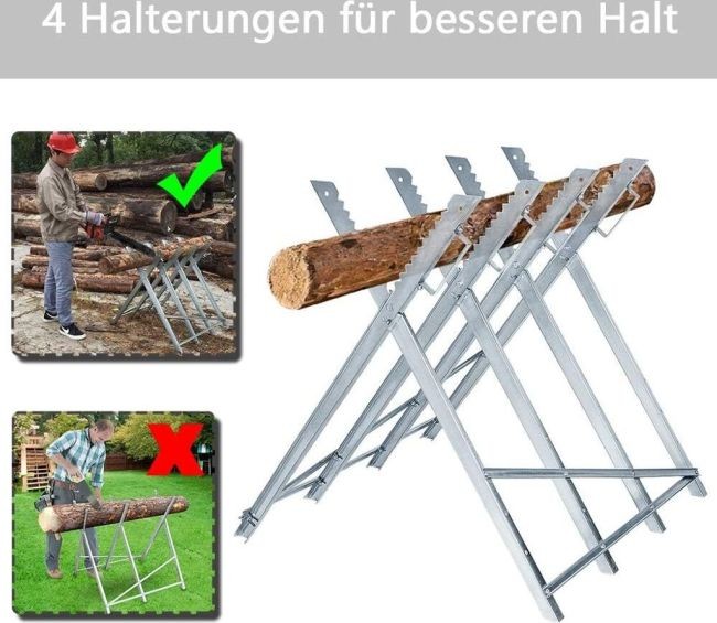 Конструкция из оцинкованной стали обеспечивает высокую устойчивость к коррозии, влаге и механическим повреждениям, поэтому подставку можно использовать на открытом воздухе без каких-либо опасений в течение всего сезона. Зубчатые держатели надежно фиксируют древесину и предотвращают ее смещение во время распиловки, значительно повышая безопасность работы.